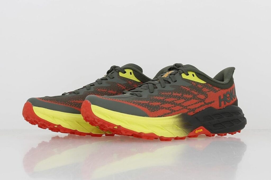 - Hoka Speedgoat 5 GTX : semelle Vibram MegaGrip avec micro-crampons Traction Lug. Parfaite sur les surfaces mixtes, roches, forêts humides et terrains montagneux.